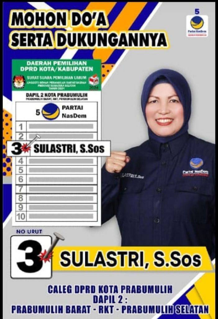 Sulastri juga menyampaikan Mohon Doa serta Dukungan nya buat masyarakat kota Prabumulih yang berada di Dapil 2 Prabumulih Barat – RKT – Selatan untuk Coblos No 3 dari Partai Nasdem .