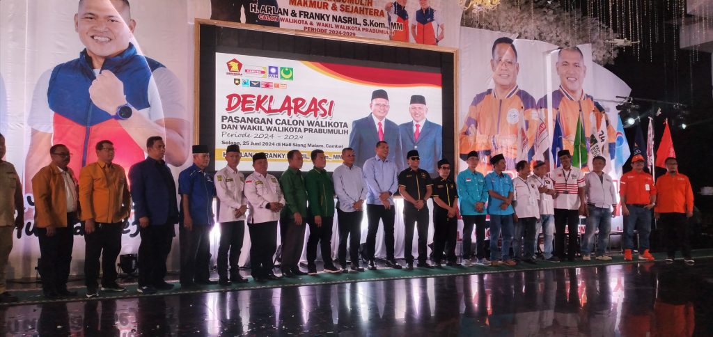 Hari ini Selasa 25 Juni 2024 Deklarasikan pasangan dan dukungan dari berbagai partai Pendukung sekota prabumulih diantaranya Partai Gerindra,Partai Hanura,Partai PAN,Partai PBB,Partai UMMAT,Partai PKN,Partai Garuda,Partai Buruh,Partai Gelora,Partai PPP,seperti yang kita ketahui bersama 5 Partai Pengusung adalah Partai yang pasca Pilcaleg beberapa waktu yang lalu sudah memiliki Kursi diParlemen diantaranya,Gerindra ( 5 Kursi ),PAN ( 2 Kursi ),PPP ( 2 Kursi ),Hanura ( 2 Kursi ),PBB ( 1 Kursi ) yang masing2 hari ini Mendeklarasikan dukungan mereka ke Pasangan H.Arlan dan Franky Nasril,S.Kom,MM di Hall Rumah Makan siang Malam hari ini.