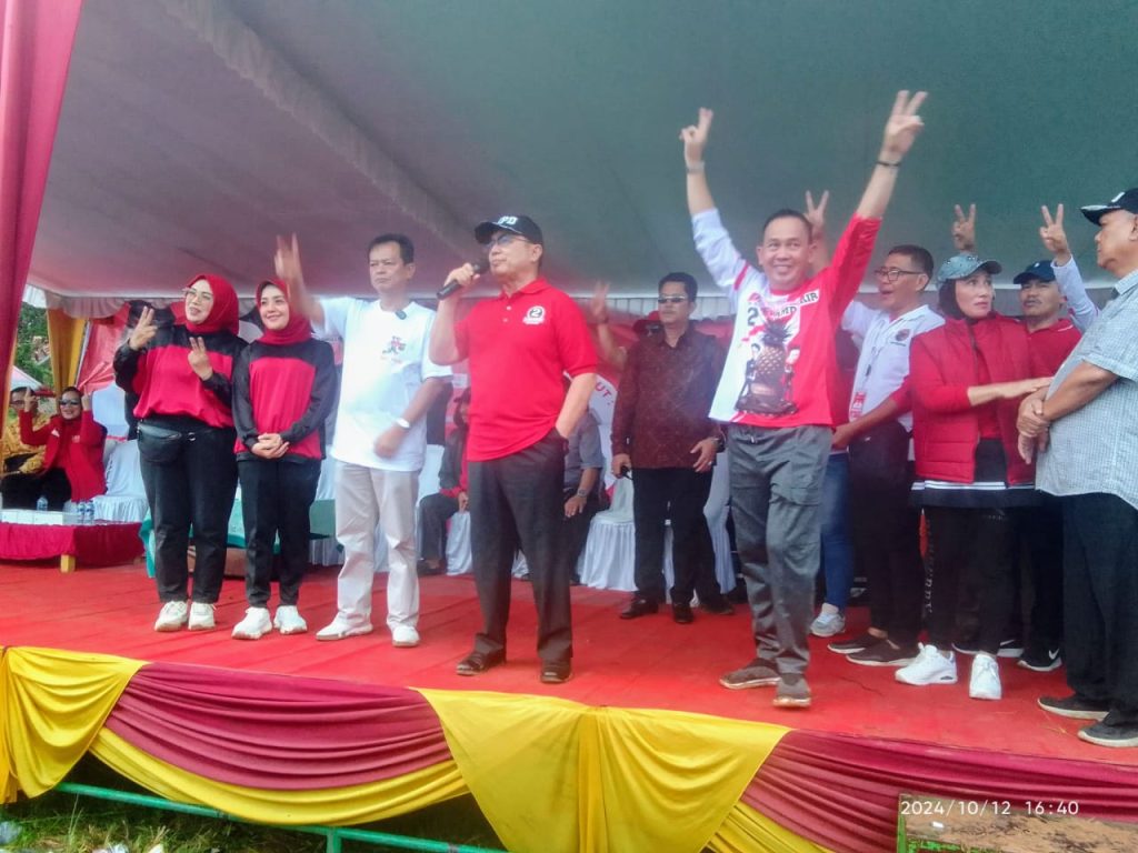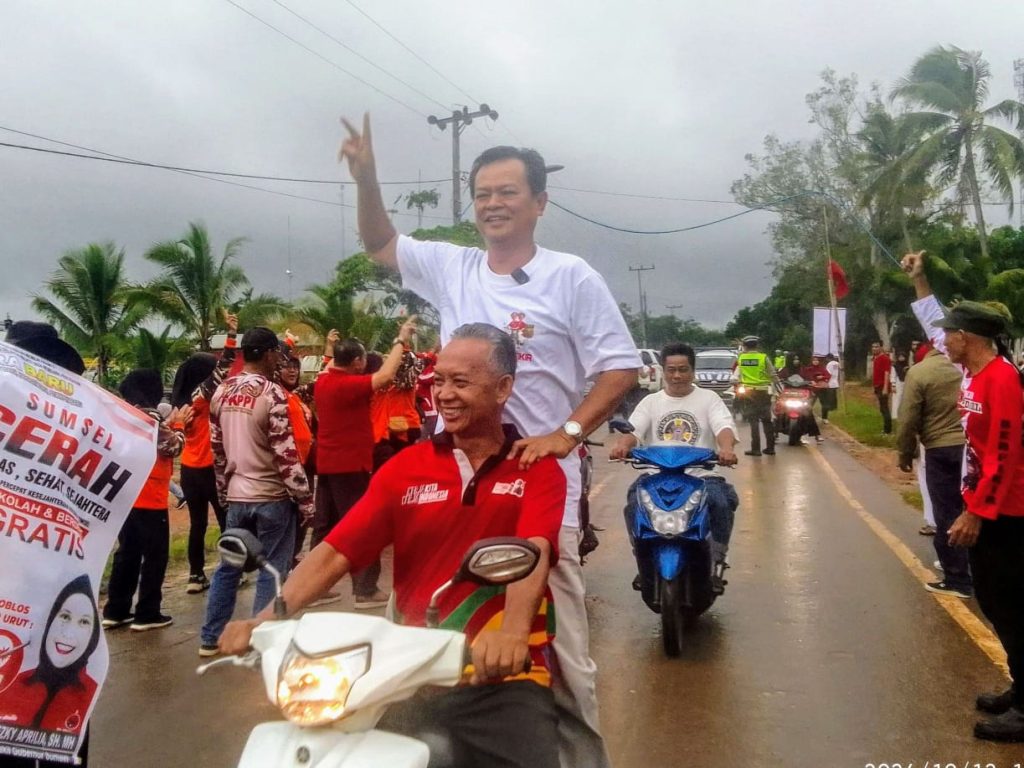 Jagatrayanews.id,Prabumulih-Kampanye terbuka Paslon 02 Fikri-Syamdakir berorasi bersama Calon Gubernur Sumatera Selatan Ir. Edy Santana Putra, MT dan Calon Wakil Gubernur Sumsel Dr. Riezky Aprilia, SH,MH di desa Tanjung Menang Kec. Prabumulih Selatan berlangsung pada Sabtu (12/10/2024). Meski sempat turun hujan cukup deras beberapa menit, warga Desa Tanjung Menang tetap semangat mengikuti kampanye terbuka tersebut. Masyarakat tetap antusias melaksanakan senam bersama sembari menunggu kedatang Calon Walikota Prabumulih H. Andriansyah Fikri, SH serta Calon Wakil Walikota Prabumulih Syamdakir Amrullah,ST. Dan juga Calon Gubernur Sumsel Ir. H. Edy Santana Putra, MT dan Wakil Gubernur Sumsel Dr. Riezky Aprilia, SH,MH.