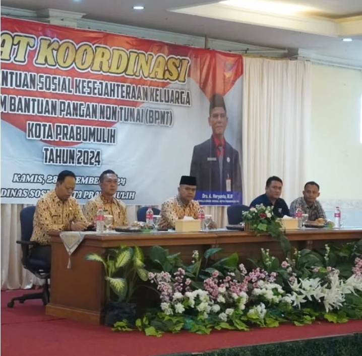 Jagatrayanews.id,Prabumulih-Penjabat Sekretaris Daerah Kota Prabumulih Drs.Aris Priadi,SH,M.Si Hadiri Rapat Koordinasi Fasilitas Bantuan Sosial Kesejahteraan Keluarga Program Bantuan Pangan Non Tunai ( BNPT ) Kota Prabumulih Tahun 2024 Di Aula Hotel Grand Nikita Prabumulih Kamis 28/11/2024.