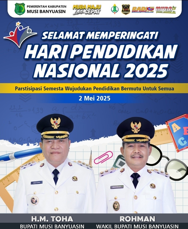 Sekayu,Jagatrayanews.id – Bupati Musi Banyuasin, HM Toha, dan Wakil Bupati Musi Banyuasin, Kiyai Rohman, pada hari ini, Jumat, 2 Mei 2025, mengucapkan selamat memperingati Hari Pendidikan Nasional (Hardiknas) 2025 dengan tema “Partisipasi Semesta Wujudkan Pendidikan Bermutu Untuk Semua.”