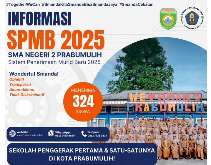 Prabumulih,Jagatrayanews.id – SMA Negeri 2 Prabumulih yang merupakan satu-satunya SMA Penggerak dan SMA Negeri Rujukan pertama di kota Prabumulih turut hadir dan melaksanakan sosialisasi di kota Prabumulih. Inti dalam sosialisasi tersebut adalah memberikan peluang kepada para peserta didik untuk dapat wawasan dan pengetahuan mengenai keunggulan dari SMA Negeri 2 Prabumulih serta menginformasikan mengenai LINK SISTEM PENERIMAAN MURID BARU PADA(SPMB) SMA NEGERI 2 PRABUMULIH TAHUN PELAJARAN 2025/2026 untuk tahun pelajaran 2025/2026 di SMA Negeri 2 Prabumulih.