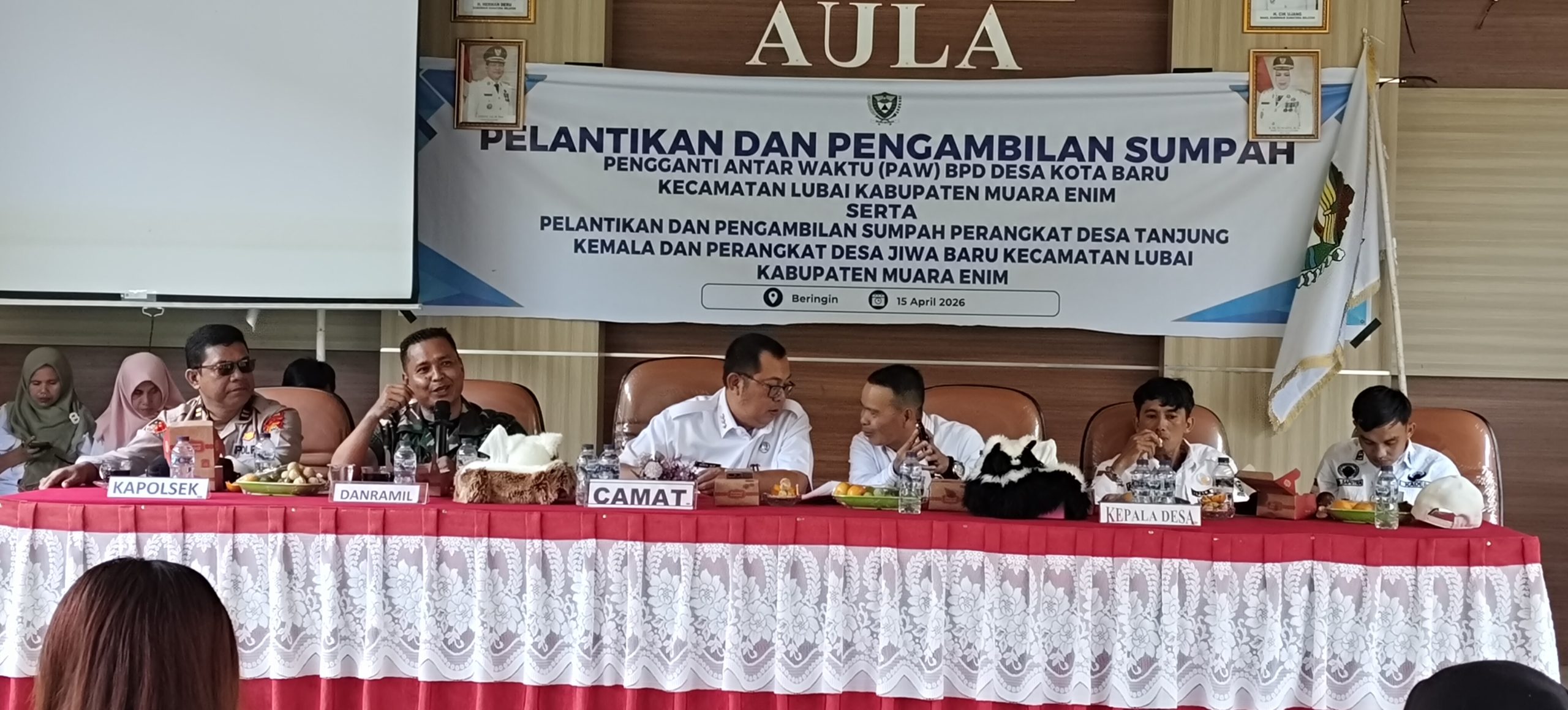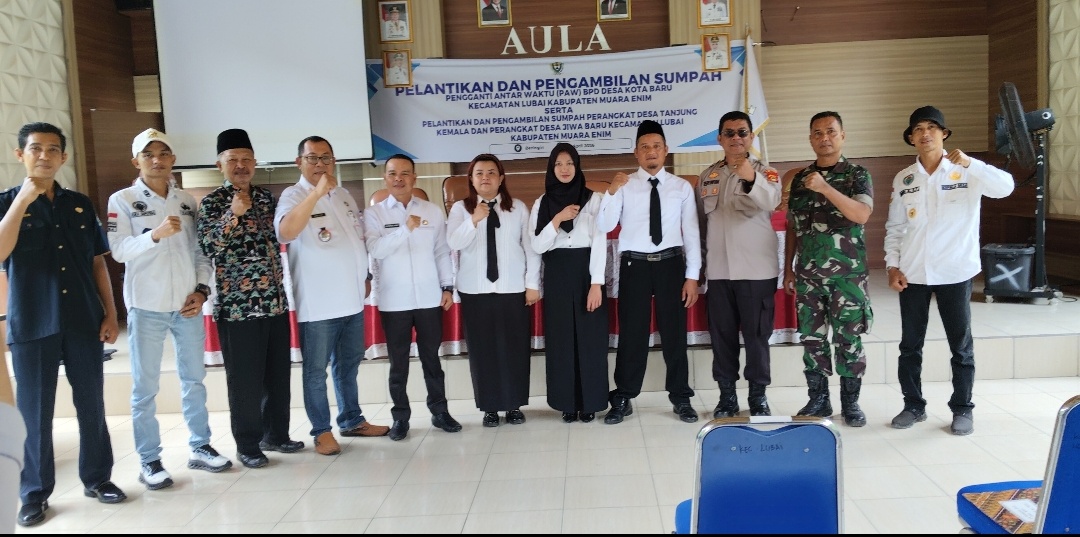 Muara Enim,Jagatrayanews.id – Pemerintah Kecamatan Lubai, Kabupaten Muara Enim, menggelar kegiatan pelantikan dan pengambilan sumpah Pengganti Antar Waktu (PAW) Badan Permusyawaratan Desa (BPD) Desa Kota Baru serta perangkat desa dari Desa Jiwa Baru dan Desa Tanjung Kemala, dalam sebuah prosesi resmi yang berlangsung khidmat Rabu 15 April 2026 di Aula Kecamatan Lubai Kabupaten Muara Enim.